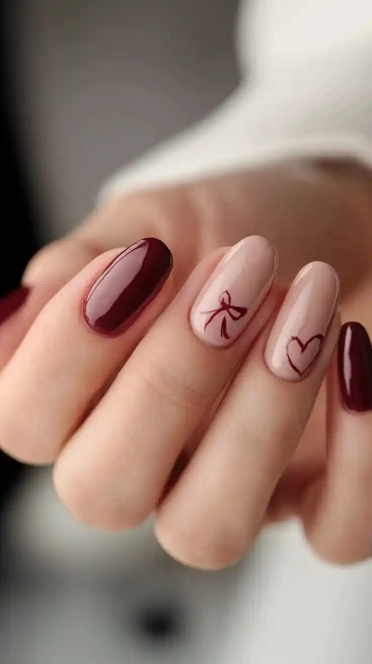 A bow and a heart never ever go out of fashion- and in the warm tones of fall they are classic. This design contains burgundy and soft-blush colors that are romantic and crisp at the same time. It is as though you are wearing your most favorite scarf and lipstick on your nails.