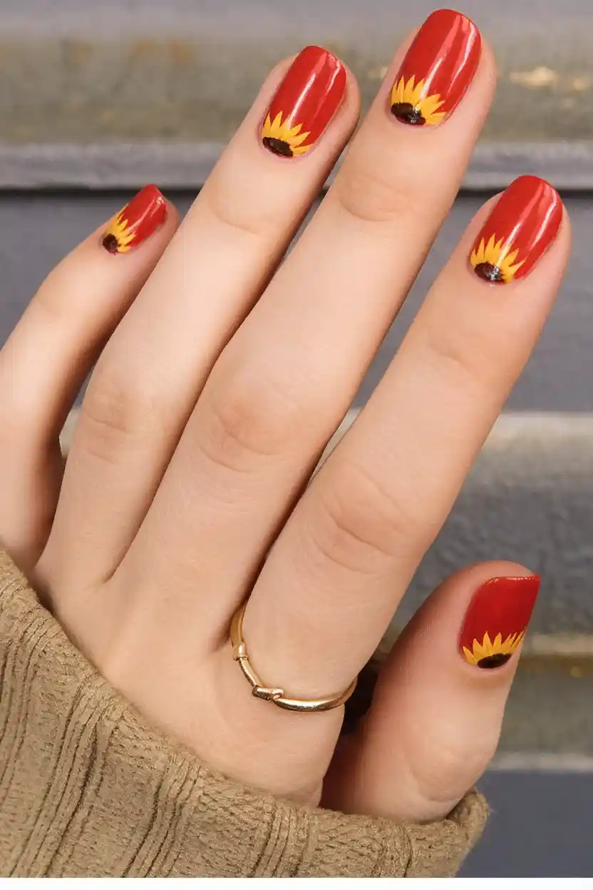 Sunflowers in fall? Yes, please. The red base is a bright color that attracts attention immediately, and mini sunflowers painted along the cuticle are that seasonal, happy twist added to it. It is very daring yet at the same time works as a daily wear.