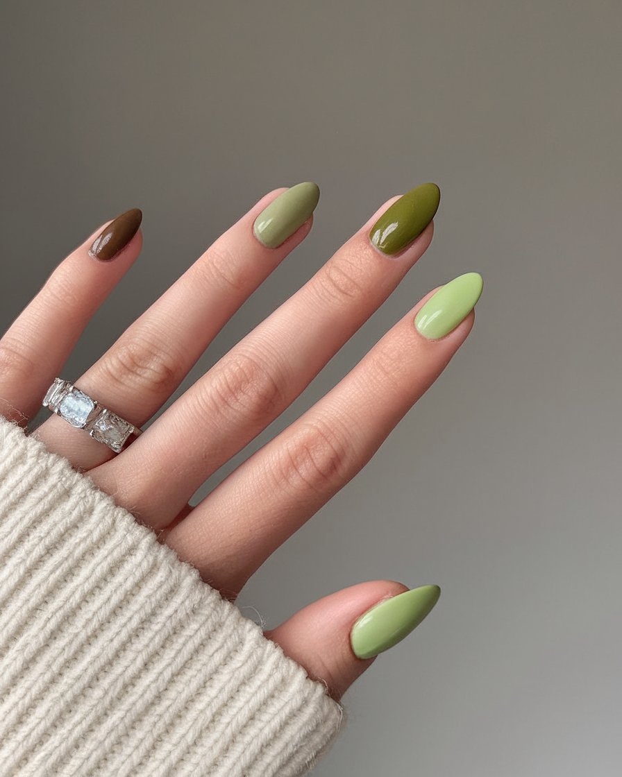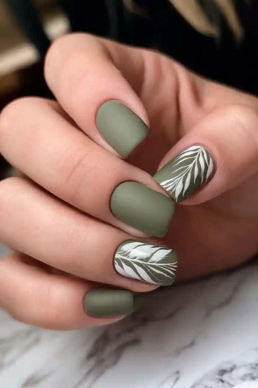 It is earthy in some way this soft olive matte finish, a cool, mossy green that looks good in contrast to soft white leaf detail in the accent nails. It is calm and nature-related, such as the walks in the forest at evening time.