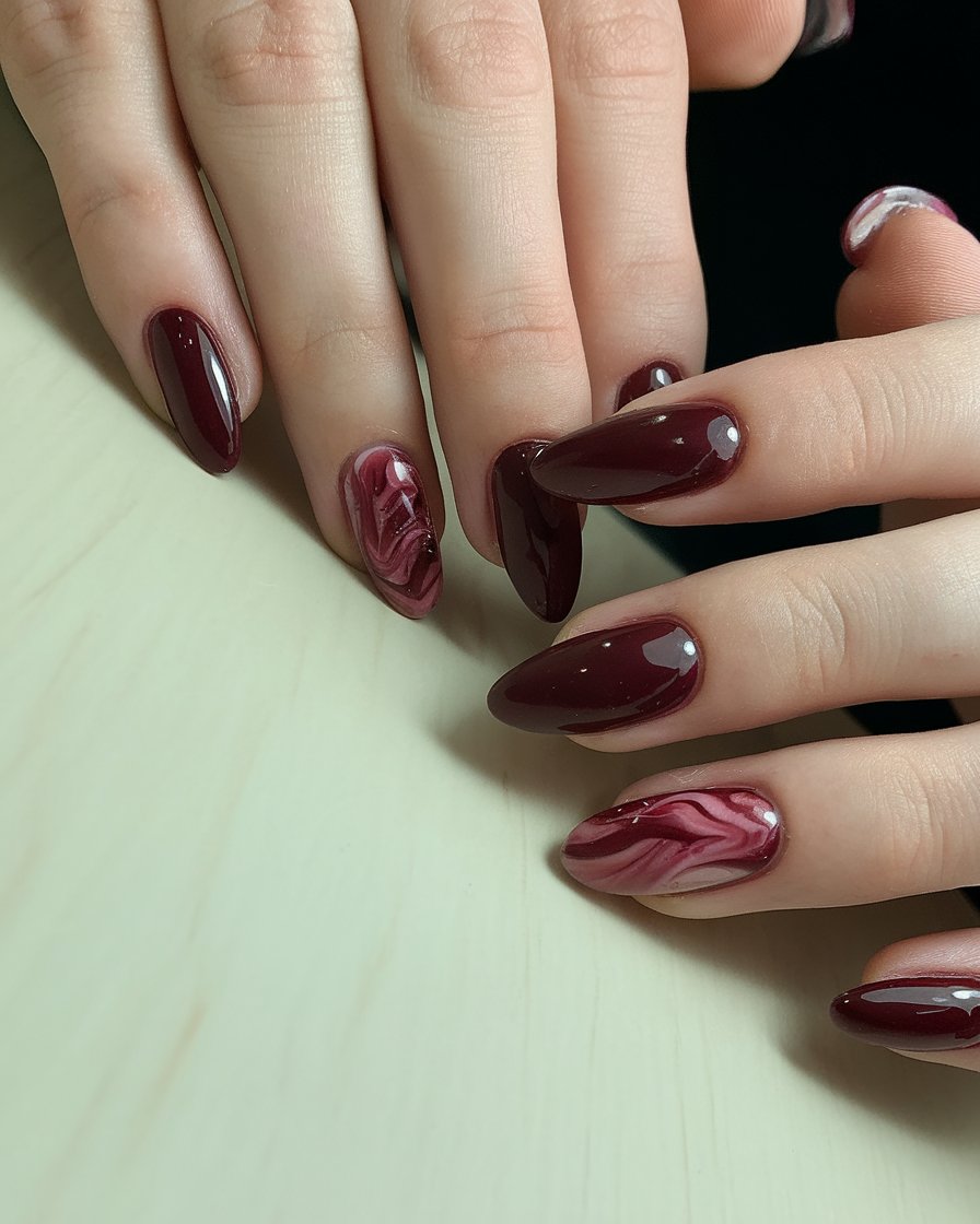 Dark berry and marbled with luxury, this design in a rich and moody color scheme will add some glam to your autumn everyday. It has a drama that is neither too much nor enough to invoke your favorite Cabernet in the form of nails. The glossy finish keeps it polished and modern.