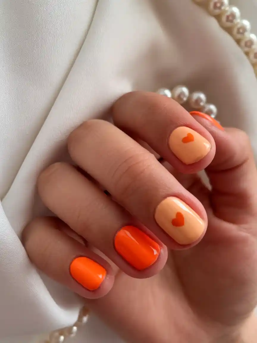 In case you would like to inject some sunshine into your fall wardrobe, then this friendly shade of orange and peach is just the ticket. The ring fingers have tiny heart-shaped fanciness that makes it sweet and funny in a loving way, and also resemble candy corn with only a little bit more sophistication.