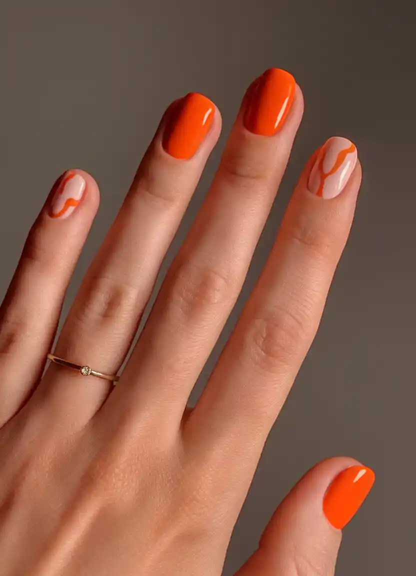 This short and simple manicure mixes rich teal blue with vibrant autumn orange for a clean yet eye-catching contrast. Two accent nails feature delicate gold leaf detailing over orange polish, adding a hint of elegance to the overall design. The rounded nail shape makes it practical for everyday wear while still delivering seasonal charm.