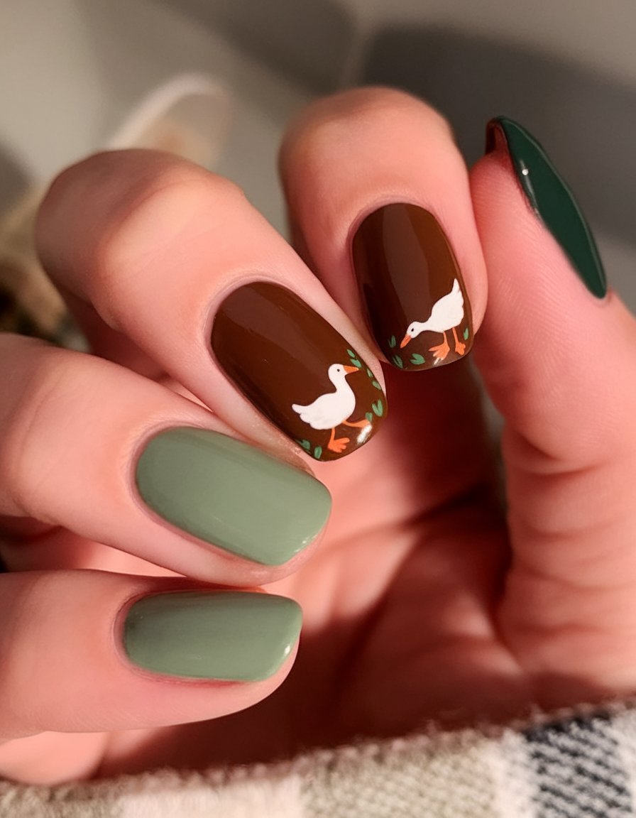 This humorous design has cute white ducks walking around a chocolate brown background which is supported by light sage green on the remaining fingernails. It is odd, cute and even quite fashionable! It is the kind of fall nail art every one would smile at your hands on.
