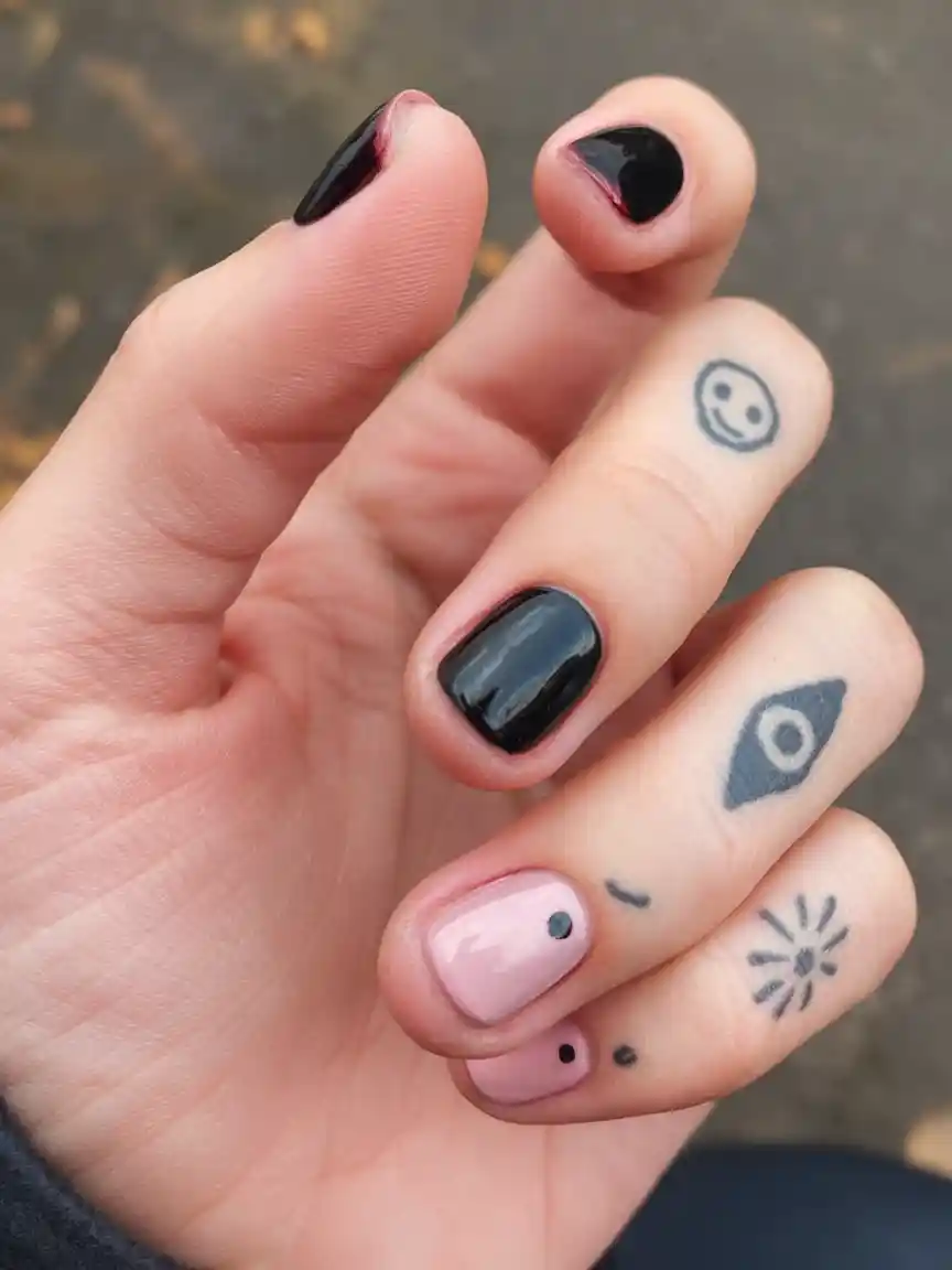 Sleek lines and considered contrasting the manicure is a combination of shiny black and blush pink with the addition of little dots that point to the minimalist like with edge. It is a tad artsy, a little melancholic and what you need for a transitional fall outfit.