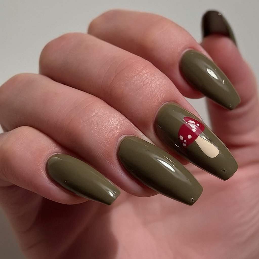 These nails seem to be taken straight out of a cozy cottagecore dream. The mood is defined by solid forest green polish with a single detail of a mushroom that makes it look playful and woodsy. It is like a fairytale stroll between the leaves calm and adorable.
