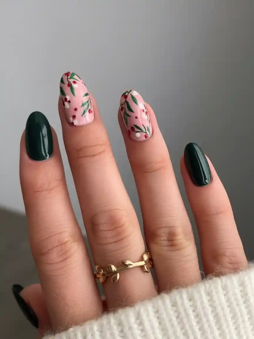 The design is somewhat soft – feminine and at the same time deep with deep green on the outside nails and light red -berry branches painted on the blush pink centers. It is the combination of nature and beauty, fresh but not freezing.