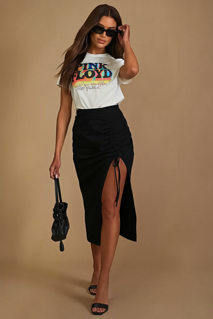 Combining street style with sophistication, this black high-slit midi skirt paired with a knotted band tee is a bold yet wearable choice. The ruched detailing adds a modern edge, while sleek black heels elevate the outfit, making it suitable for a summer night out.