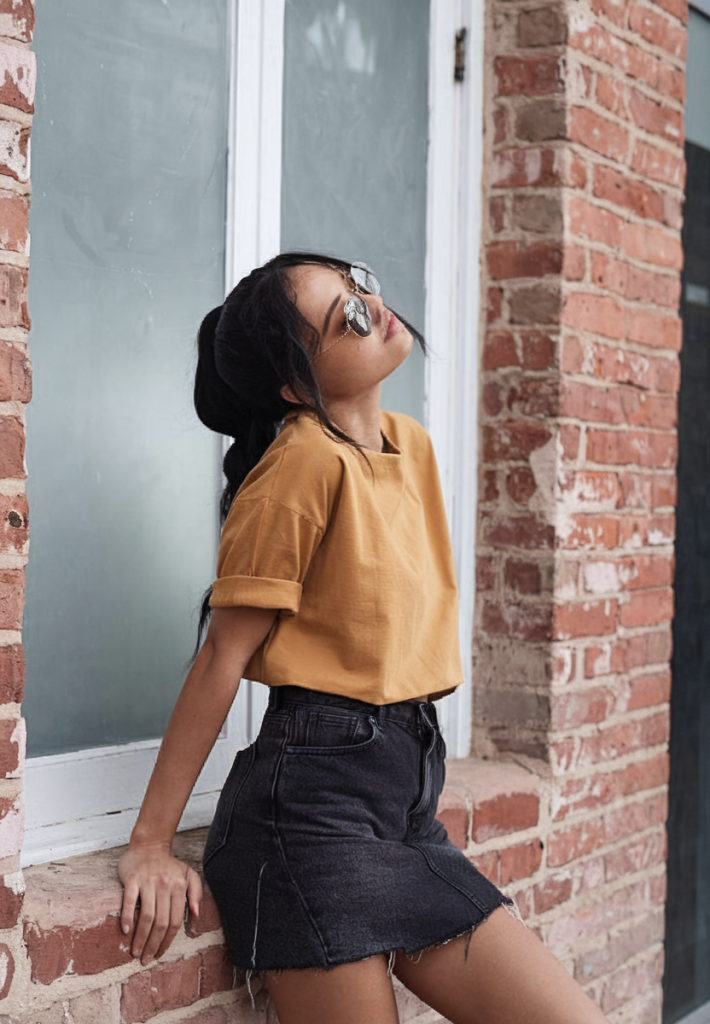 Nothing says casual summer like a jean mini skirt. This look pairs a high-waisted, frayed denim skirt with a tucked-in mustard tee, creating a laid-back yet put-together vibe. The rolled sleeves and retro sunglasses add personality, making it a go-to for everyday wear.
