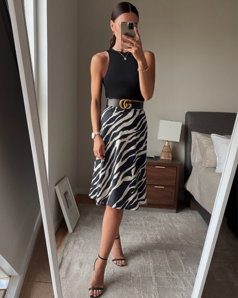 Animal prints are making a statement in 2025, and this zebra-print midi skirt paired with a fitted black tank is a bold yet sophisticated choice. The cinched waist with a statement belt adds structure, while black strappy heels refine the ensemble.