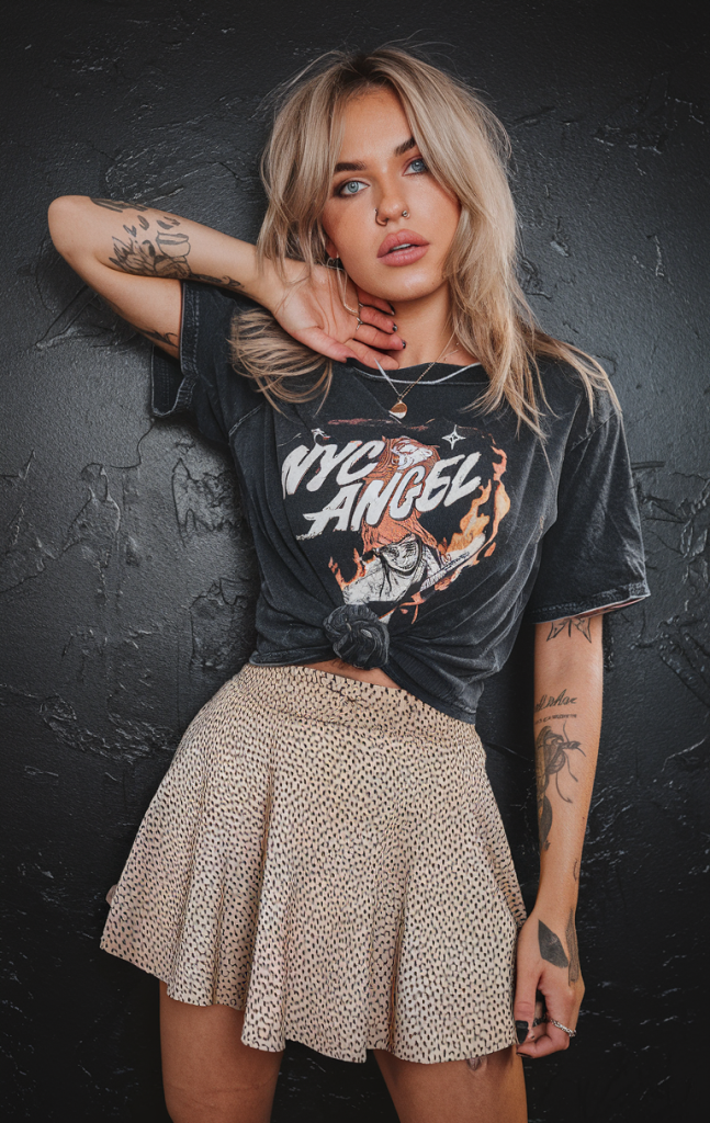 Pairing a pleated mini skirt with a knotted vintage tee creates an effortlessly cool, rocker-chic vibe perfect for city strolls and concerts. The soft, flowy skirt contrasts with the structured, slightly oversized tee, balancing femininity with a rebellious edge. Accessories like stacked rings, layered necklaces, and black boots or sneakers complete the aesthetic while keeping the look grounded in comfort.