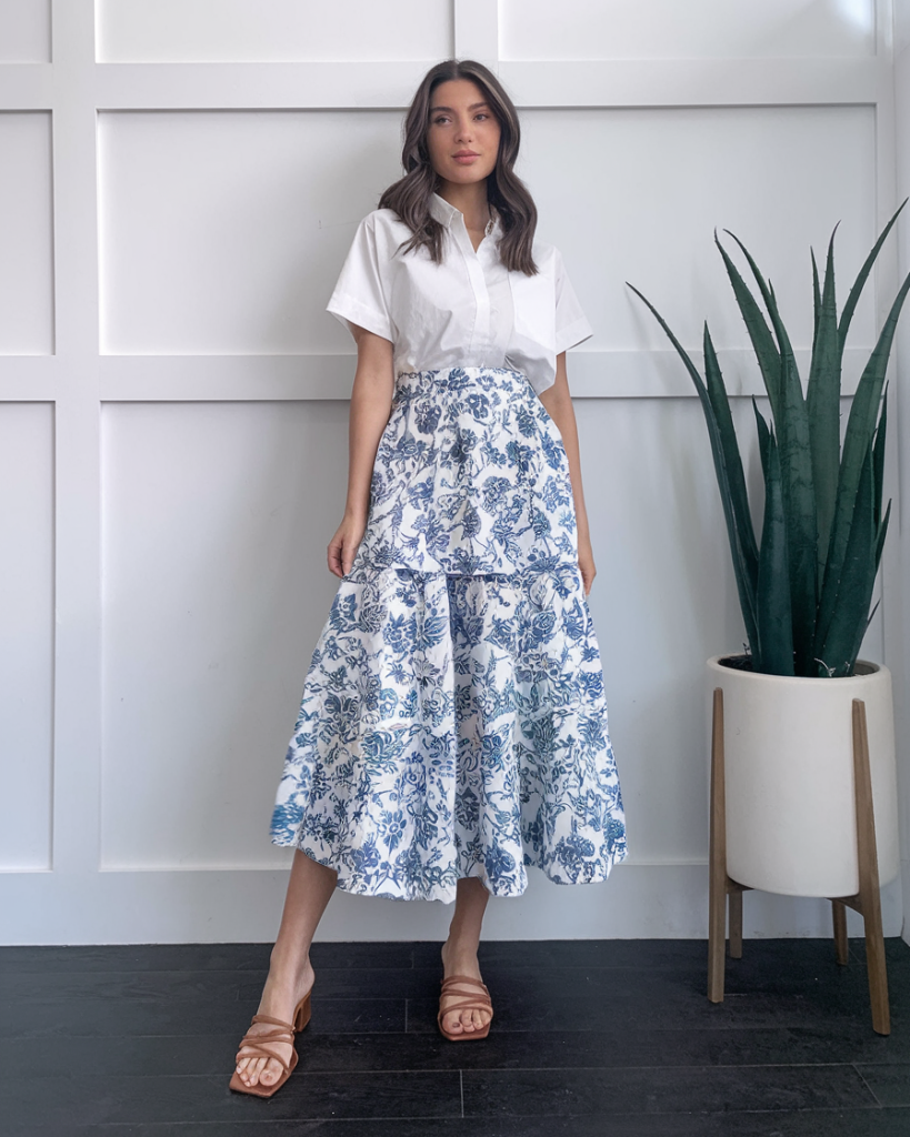 A long white and blue maxi skirt with intricate patterns exudes a refined, timeless charm. Styled with a crisp white top, this outfit is a dream for garden parties, weekend brunches, or seaside vacations. The structured blouse provides a polished appeal, while the flowy skirt moves gracefully, ensuring comfort in warm weather.