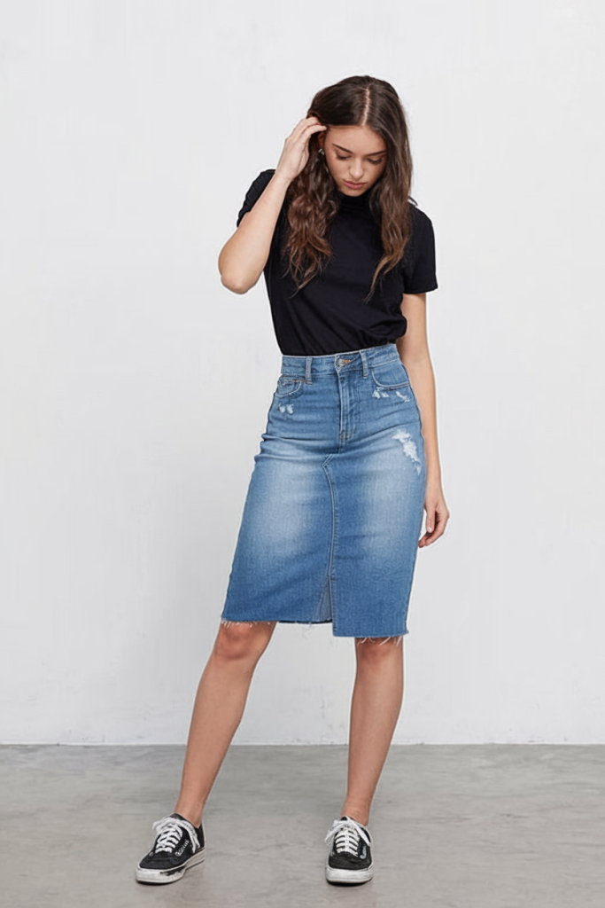 A jean skirt is a summer essential that pairs effortlessly with a classic black T-shirt for a laid-back, casual outfit. The distressed denim adds a bit of edge, while the fitted tee keeps things sleek and simple. Sneakers keep the look youthful and practical, making it perfect for everyday wear.