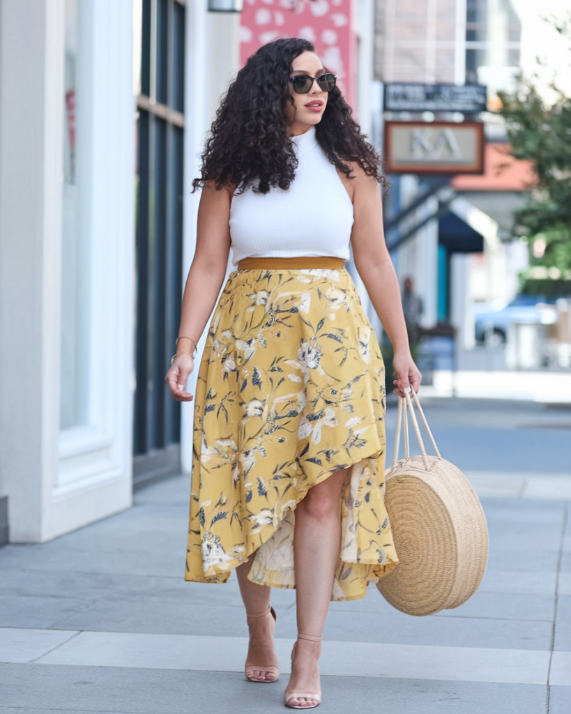 A high-low midi skirt in a floral print screams summer. Paired with a fitted white tank top, the ensemble is both breathable and elegant. The asymmetrical hemline adds movement, while nude heels elongate the legs, making this look ideal for a rooftop brunch or a weekend getaway.
