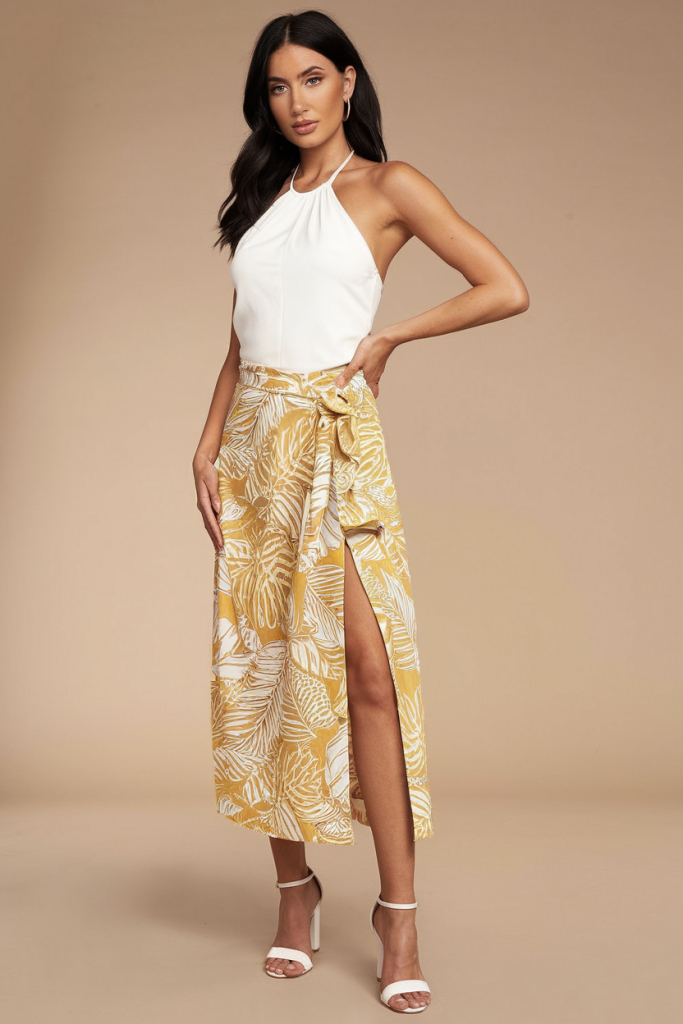 Summer calls for bold prints, and a vibrant maxi skirt with tropical motifs is the perfect way to embrace the season. Paired with a fitted white halter top, this outfit is equal parts fresh and sophisticated, ideal for vacations, beachside lunches, or summer events.