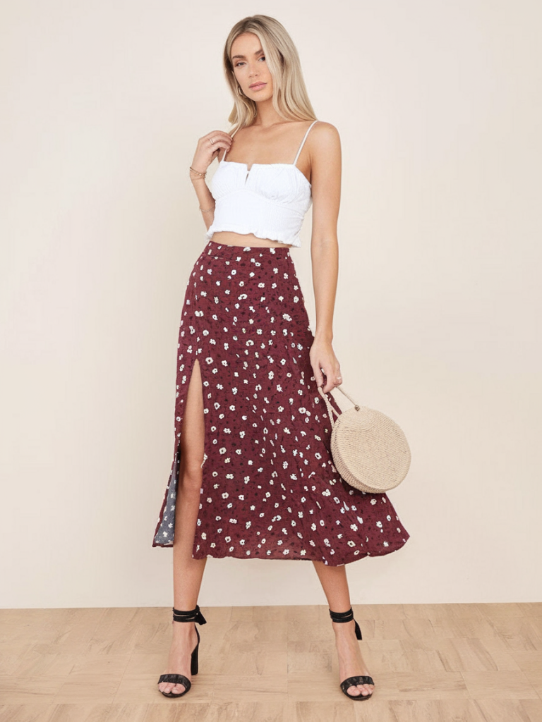 A flowy, floral midi skirt in deep burgundy is the definition of casual summer chic. The lightweight fabric and flirty slit offer both style and functionality, making it a go-to for warm days. Paired with a white top, the contrast enhances the richness of the skirt’s color.