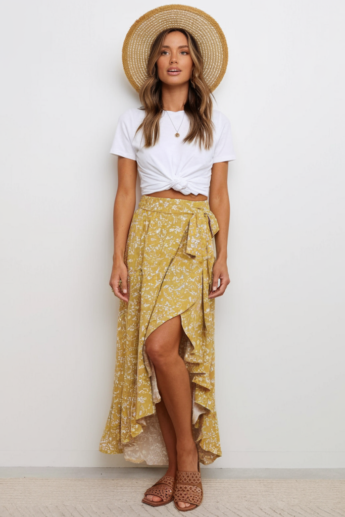 A breezy long slit skirt in an earthy print, styled with a fitted crop top and a wide-brimmed hat, channels ultimate bohemian vibes. Perfect for music festivals or a stylish shopping day, this look is both effortless and fashion-forward.