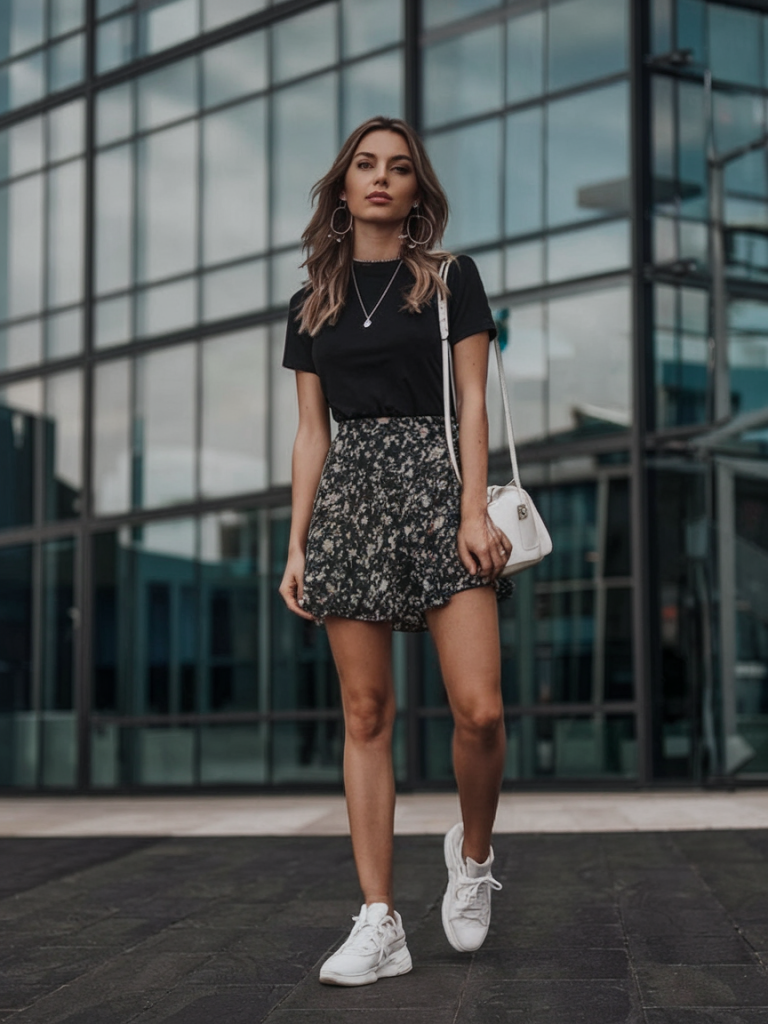 For those who love an edgy yet feminine look, a black floral mini skirt paired with a sleek black tee is a summer staple. The monochromatic color scheme adds sophistication, while the flowy silhouette ensures comfort. White sneakers and a crossbody bag add the perfect casual touch.