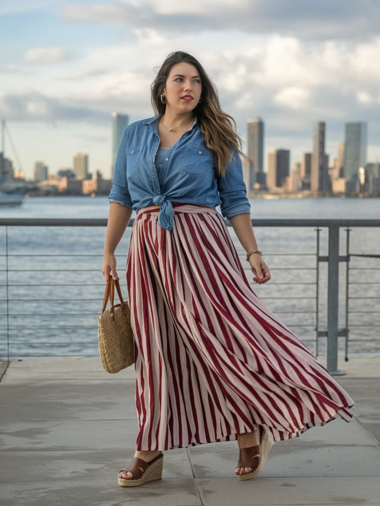 A maxi skirt with vertical stripes paired with a knotted jean shirt creates a polished yet laid-back summer outfit. This look works well for black women, as the contrast of bold colors complements rich skin tones beautifully.