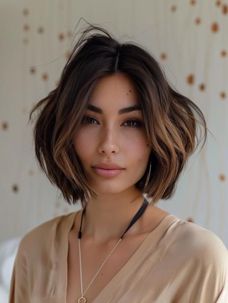 This tousled brunette bob features subtle layers that add volume and movement, giving the hairstyle an effortless, lived-in look. Perfect for those who love low-maintenance styling, this modern bob frames the face beautifully while offering a chic, casual vibe.