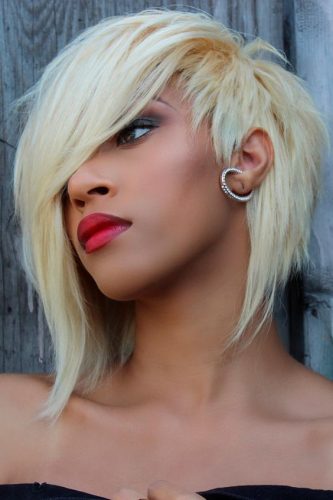Side-swept bangs add a soft, romantic feel to the asymmetrical bob, ideal for softening angular features.