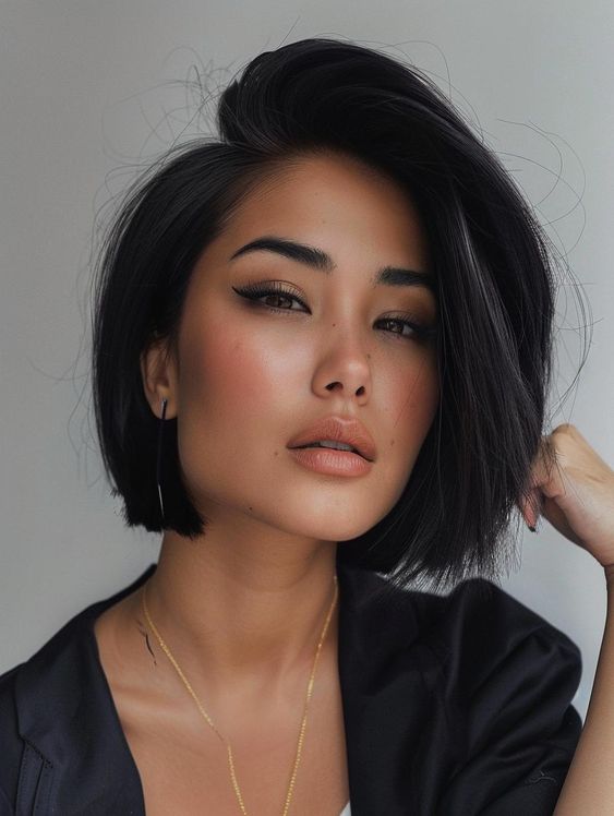 This edgy black bob features a dramatic side-swept part, adding volume and dimension. The sleek, glossy finish gives the haircut a bold, fashion-forward look that’s perfect for those who want a powerful yet feminine hairstyle that exudes confidence.