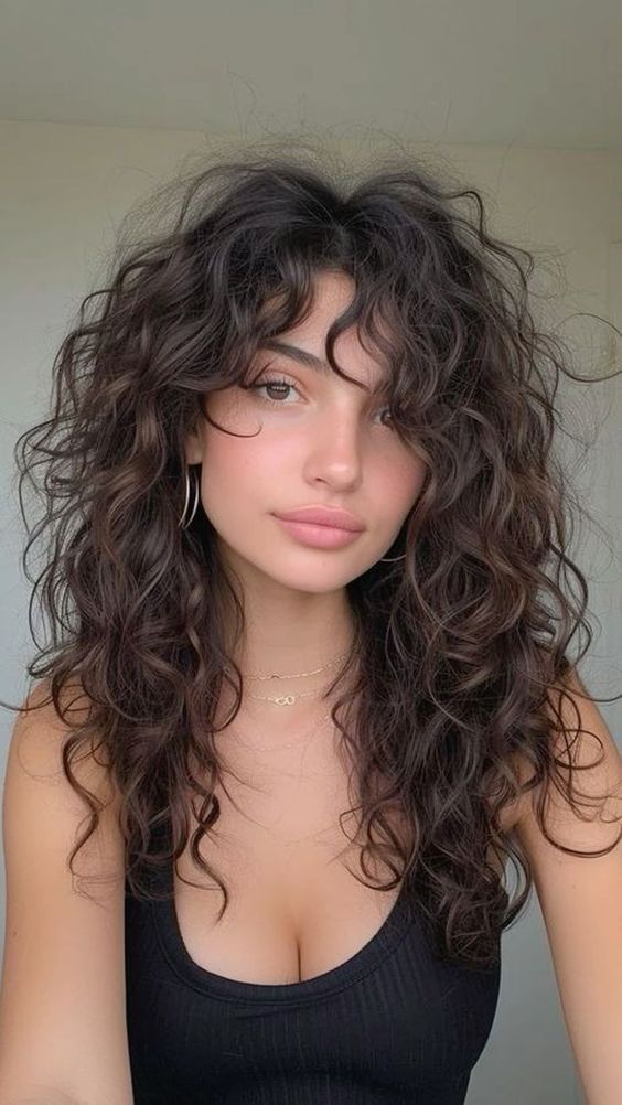 This voluminous curly shag offers effortless texture and movement, complemented by soft bangs that frame the face. The layers enhance the natural curls, making this hairstyle ideal for anyone looking to embrace their natural hair with a relaxed, boho-chic vibe.