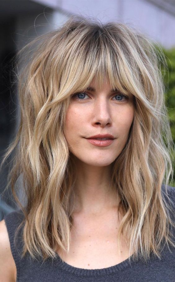 This textured lob (long bob) brings a relaxed, tousled look with added fringe for a bit of edge. The choppy layers give the hairstyle a lived-in feel, ideal for those wanting a low-maintenance but fashion-forward haircut that’s perfect for everyday wear.