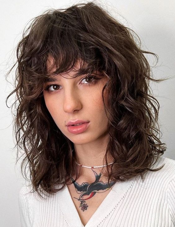 20. Voluminous Curly Shag with Bangs for a Natural Look