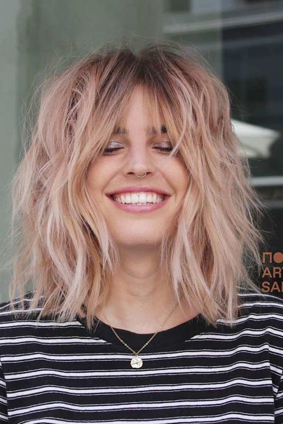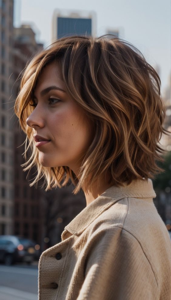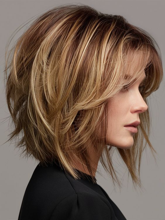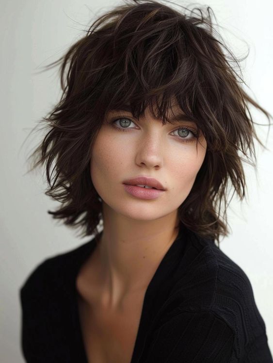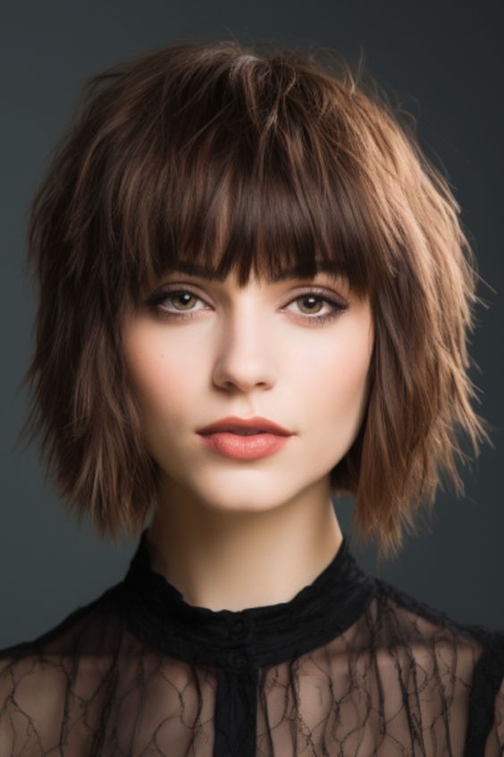 A modern take on the shaggy bob, this style is perfect for adding volume and texture. The wispy bangs and tousled layers create a carefree, edgy look that pairs well with casual or stylish outfits, making it a versatile option for any occasion.