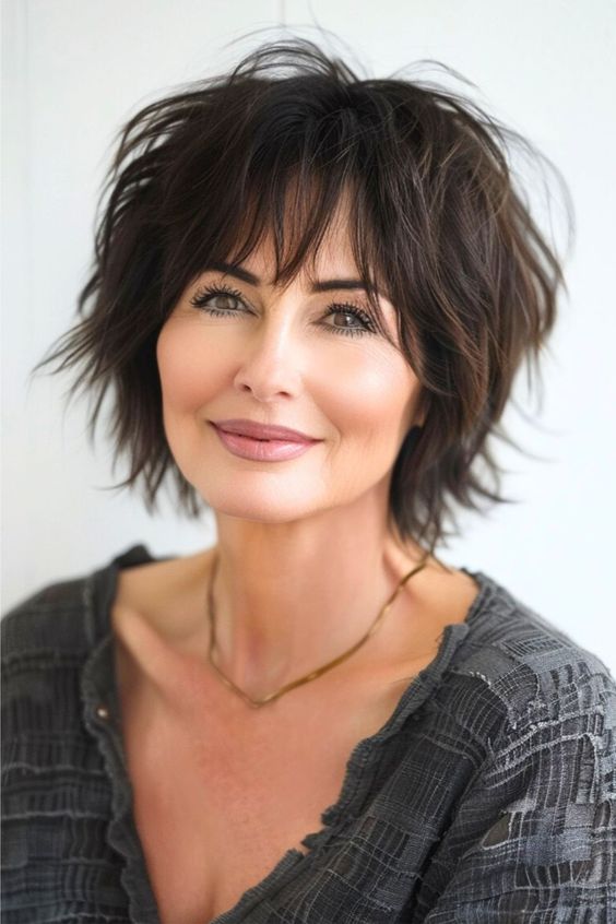 This short shaggy bob is the perfect choice for mature women looking for a modern and elegant hairstyle. The feathered layers give the cut an airy feel, while the light texture provides a soft and youthful appearance that is both easy to maintain and style.