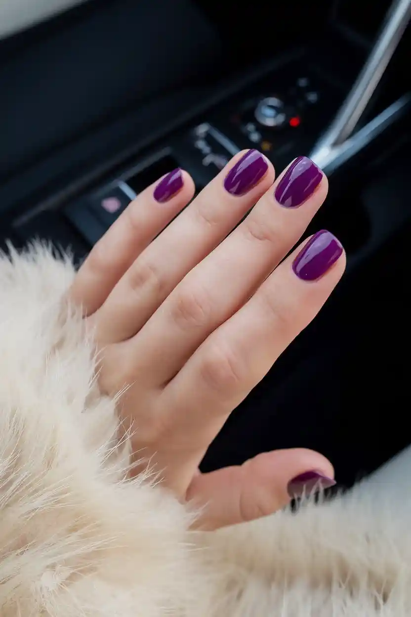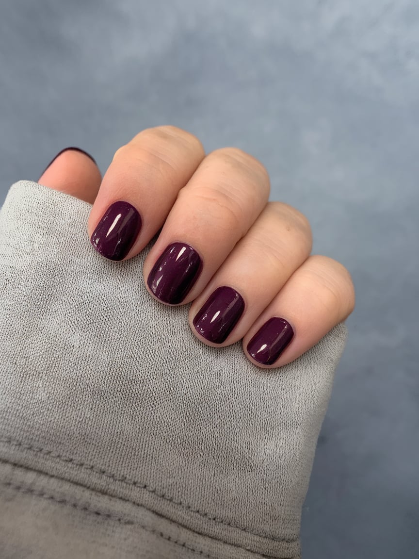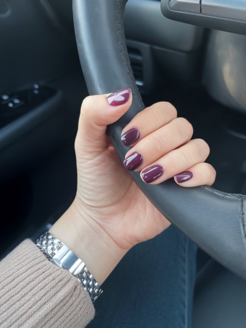 There’s something incredibly chic about this plum polish in a city setting. The shiny finish paired with that bold shade evokes confidence — like you’ve just stepped out of a cab, fur collar flipped, ready to conquer the world (or at least your meeting).