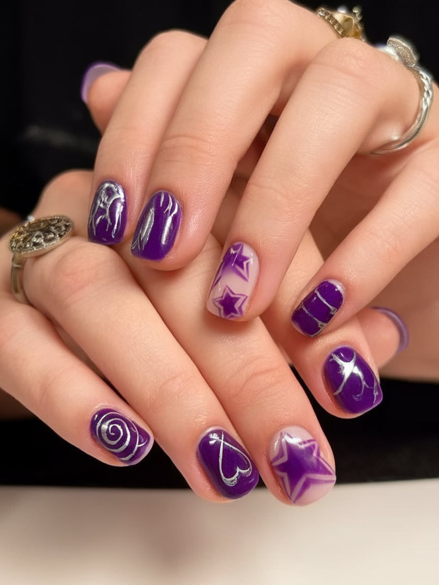 Whimsical, expressive, and a little retro — this purple pop art look is made for anyone who still has a playful streak. With stars, hearts, spirals and lightning motifs, it’s like a little storybook on your hands.