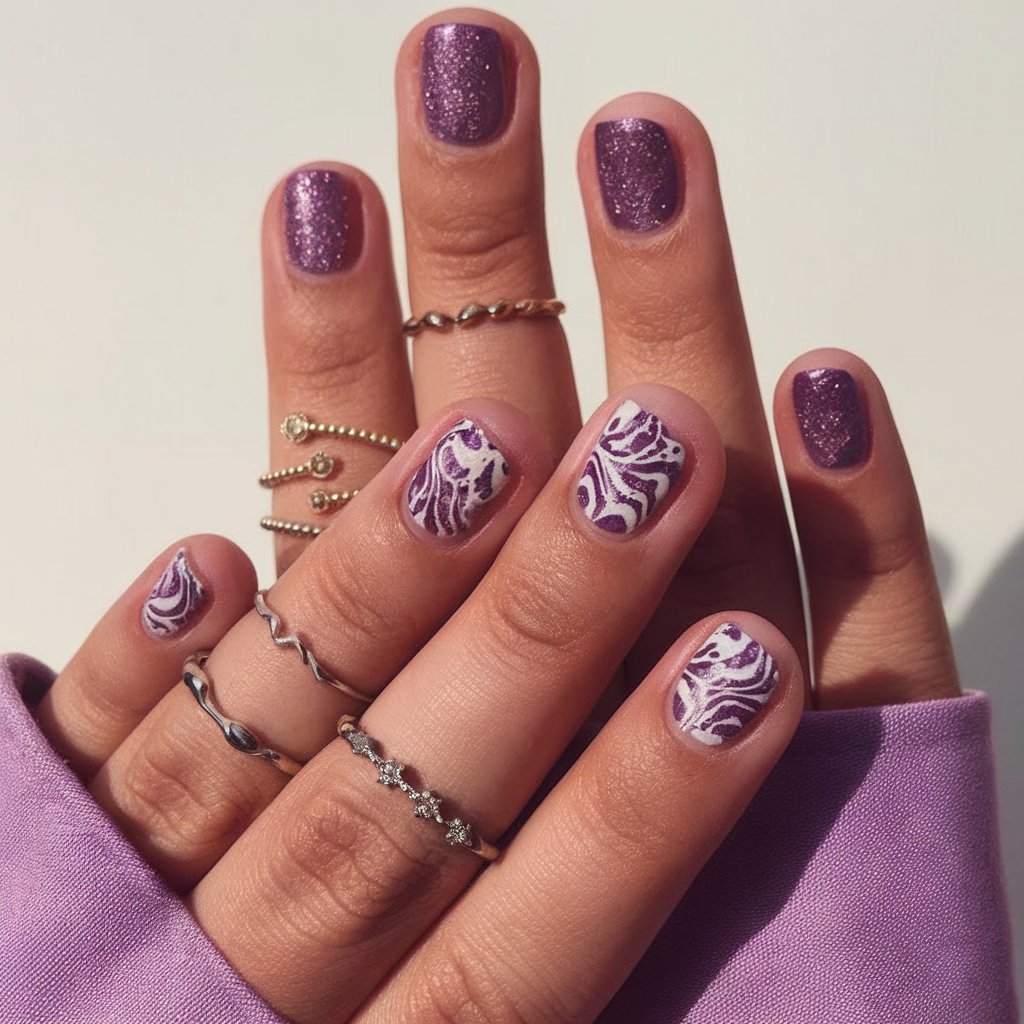 Playful and artsy, this art designs short look pairs delicate purple marbling with twinkly glitter. It’s a perfect blend of calm and glam — like wearing lavender perfume with your favorite leather boots. Unexpected, yet it works.