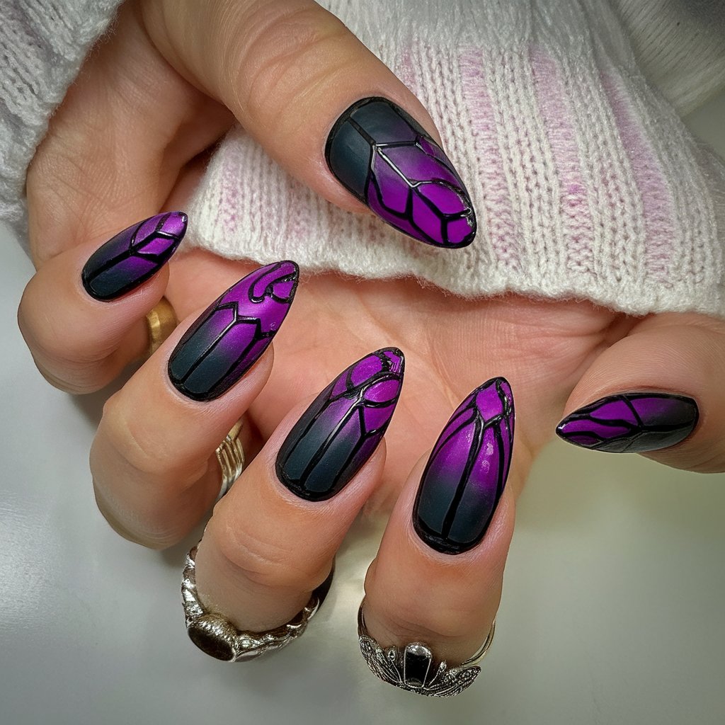 This dramatic black-and-purple mani gives total stained glass vibes — artistic, moody, and just a little mysterious. It’s like Halloween met high fashion, and the result is pure art designs acrylic heaven.
