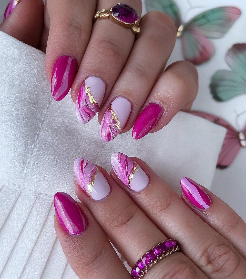 Feminine and stylish, this design blends magenta hues with delicate marble art designs and subtle gold veins. It gives the illusion of hand-painted elegance — like fine porcelain in nail form.
