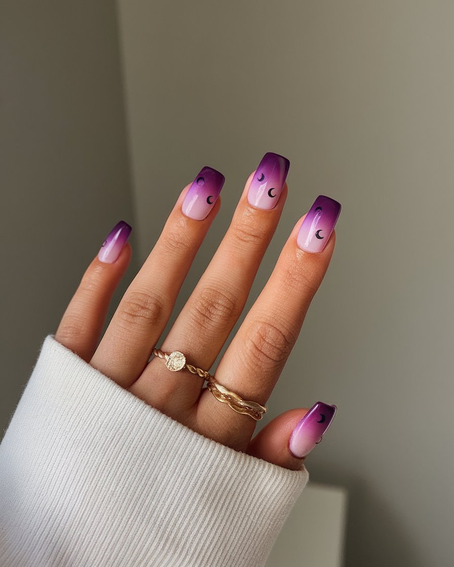 These square-tipped beauties blend soft lavender into deep violet with delicate moon accents, like a mystical transition from dusk to night. It’s soft, mysterious, and totally perfect for fall.