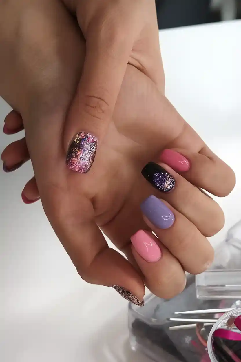 Why settle for one shade when you can play with five? This pastel mix of lavender, pink, and purple with a sprinkle of glitter is like a sugar rush for your fingertips — fun, youthful, and anything but boring.