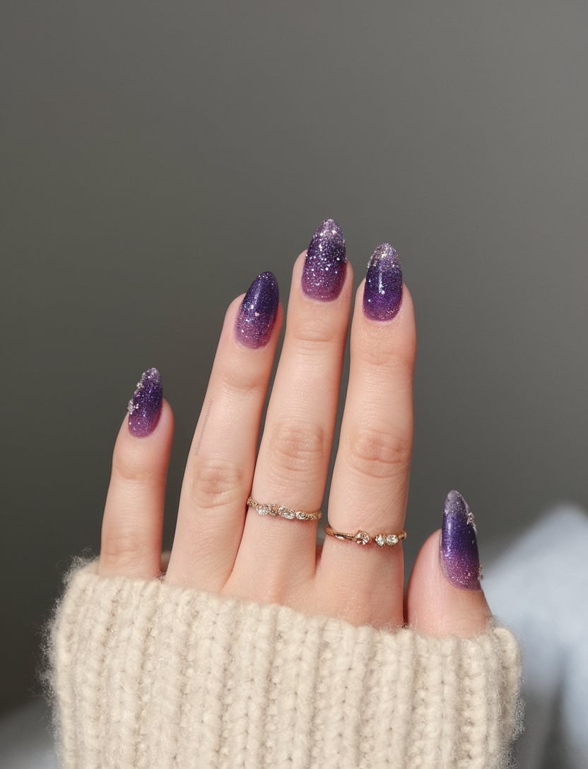 These ombré galaxy nails feel like a dreamy portal to the stars. The blend of indigo and violet layered with glitter evokes a romantic fall night under crisp skies. It’s playful but not juvenile — more celestial than cartoon.