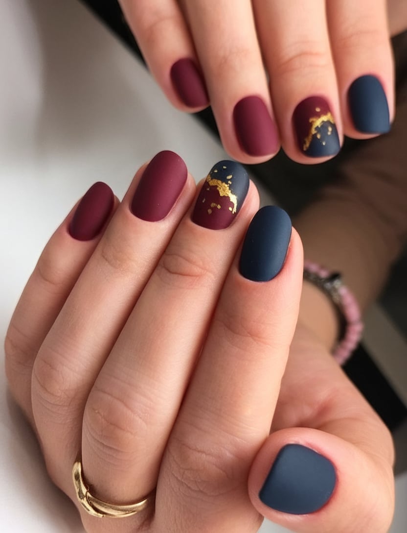 Bold yet sophisticated, this matte mix of mulberry and deep navy is pure 2025 editorial energy. The soft matte finish keeps the look grounded while the gold foil detailing adds just a flicker of art designs simple charm.