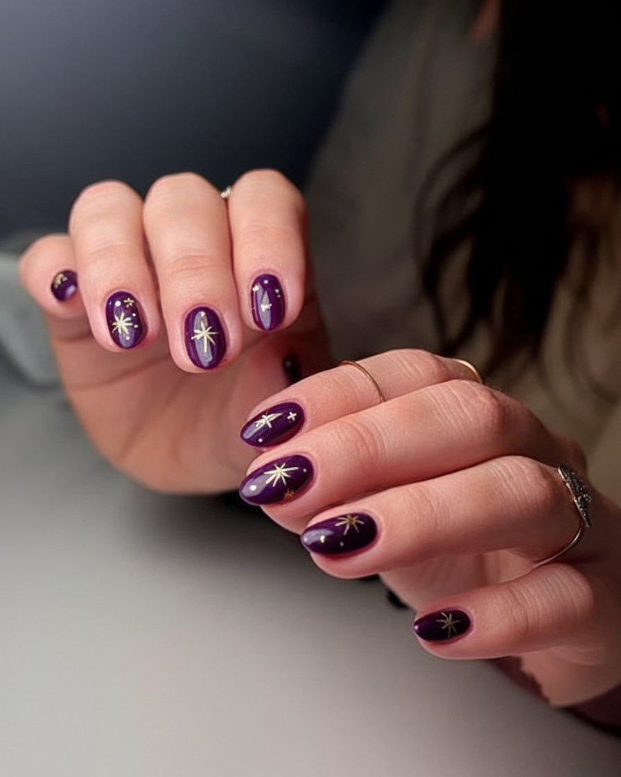 The golden celestial art on these nails turns a dark purple base into something truly magical. It whispers of autumn nights, candlelight, and cozy conversations under starlit skies — a little nostalgic, a little modern.