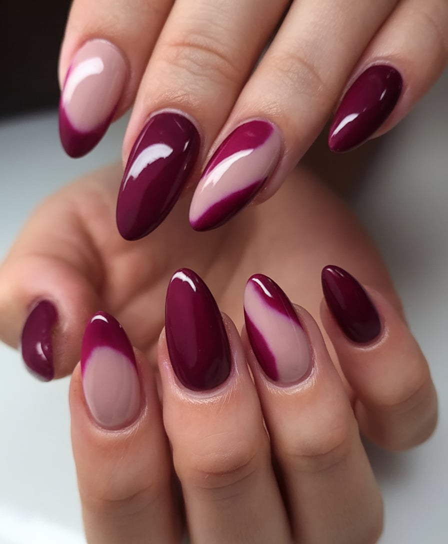 This sculptural French mani remix is a real eye-catcher. With smooth curves of wine and nude shades dancing across the nail, it feels both artistic and abstract — like an oil painting come to life.