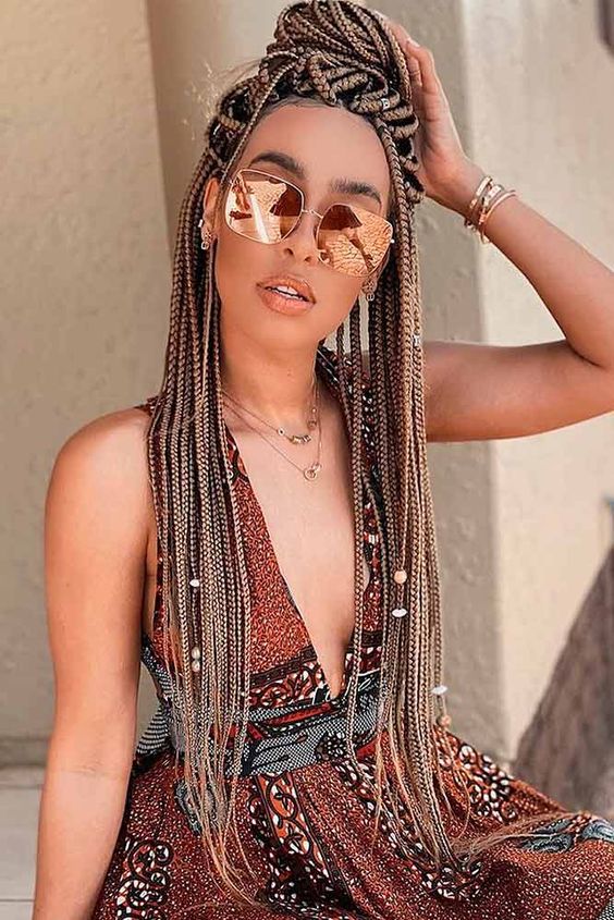 This stylish box braid hairstyle features long, sleek braids gathered into a high bun with the rest flowing gracefully. Accented with beads, the braids add an extra touch of glam. Paired with sunglasses, this look exudes confidence and elegance, perfect for a chic summer vibe.