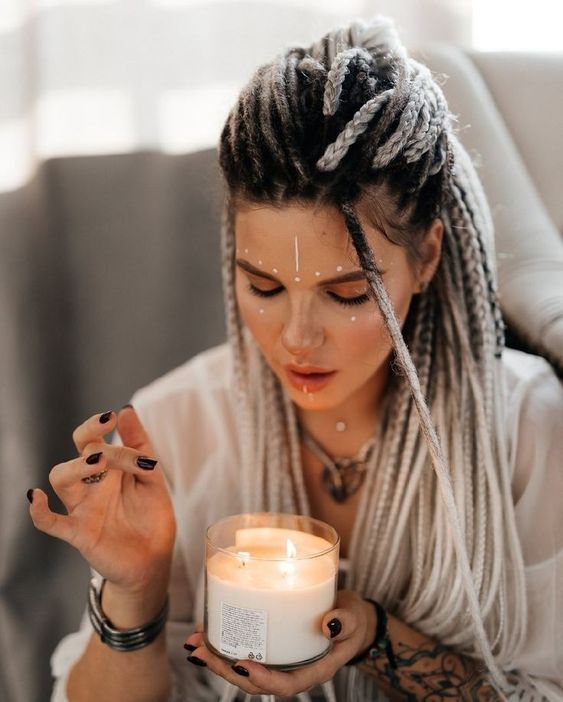 This ethereal style combines black and silver box braids for a striking contrast. The soft, relaxed braids are perfect for those seeking a mystical, bohemian look. The addition of tribal-inspired face paint adds to the spiritual aesthetic, making this a captivating and unique style.