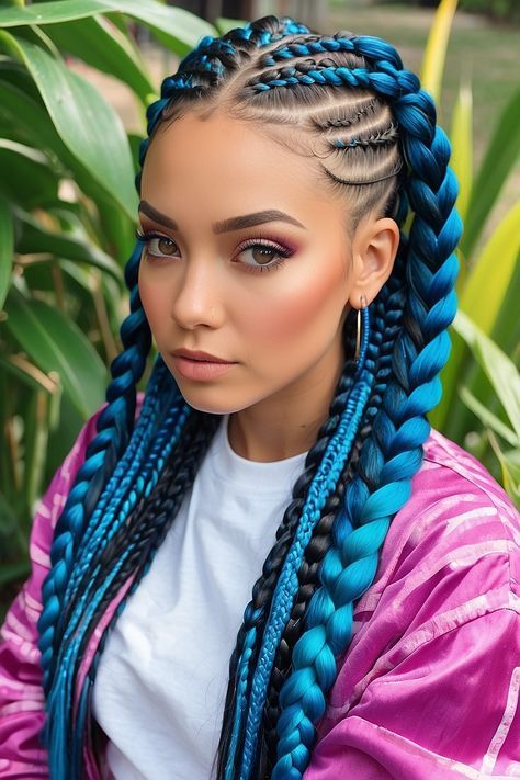 These vibrant blue box braids are striking and playful, combining deep blue hues with sleek black undertones. The braids are thick and expertly woven, creating an edgy, eye-catching look that stands out in any setting, perfect for expressing bold individuality and creativity.