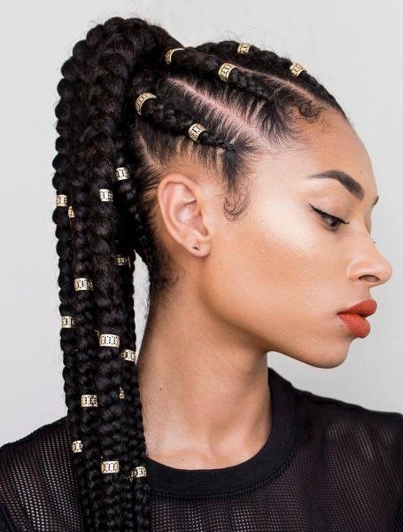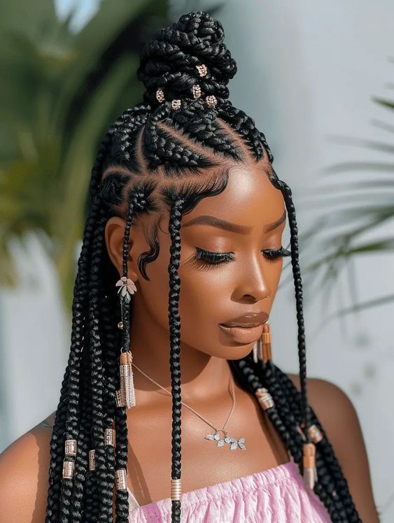 21. High Bun Box Braids with Beads for a Bold, Stylish Look