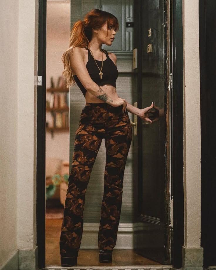 If your style leans toward casual but still trendy, a printed crop top and patterned flare pants make for a cool, laid-back club outfit. This look is perfect for a hip hop night or a more relaxed jeans and sneakers kind of club vibe. The earthy tones keep it low-key while still feeling fashionable. Paired with layered gold jewelry and a denim jacket, this is an effortless outfit that balances sport and night dress aesthetics.