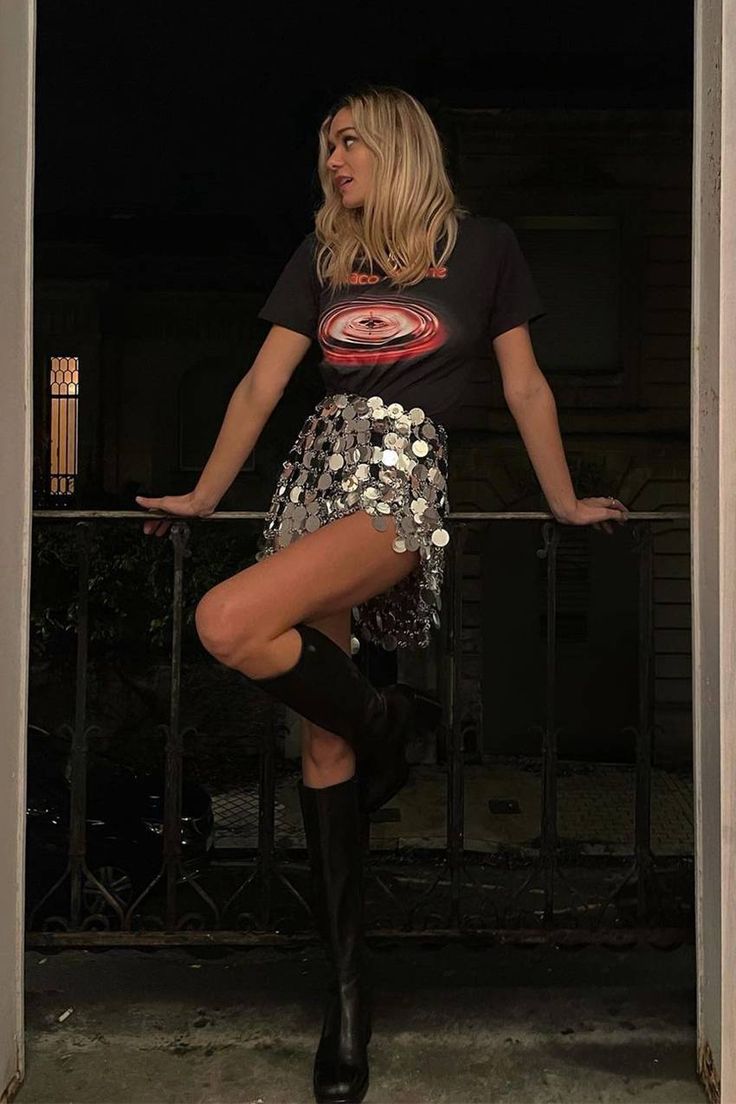 Mixing casual with glam, this outfit pairs a retro-inspired graphic tee with a high-shine, mirror sequin mini skirt. The contrast between relaxed street style and high-fashion sparkle creates a fresh and modern look. Paired with knee-high leather boots, this ensemble is perfect for a party, music festival, or stylish city outing. Keep accessories minimal and let the outfit be the statement.