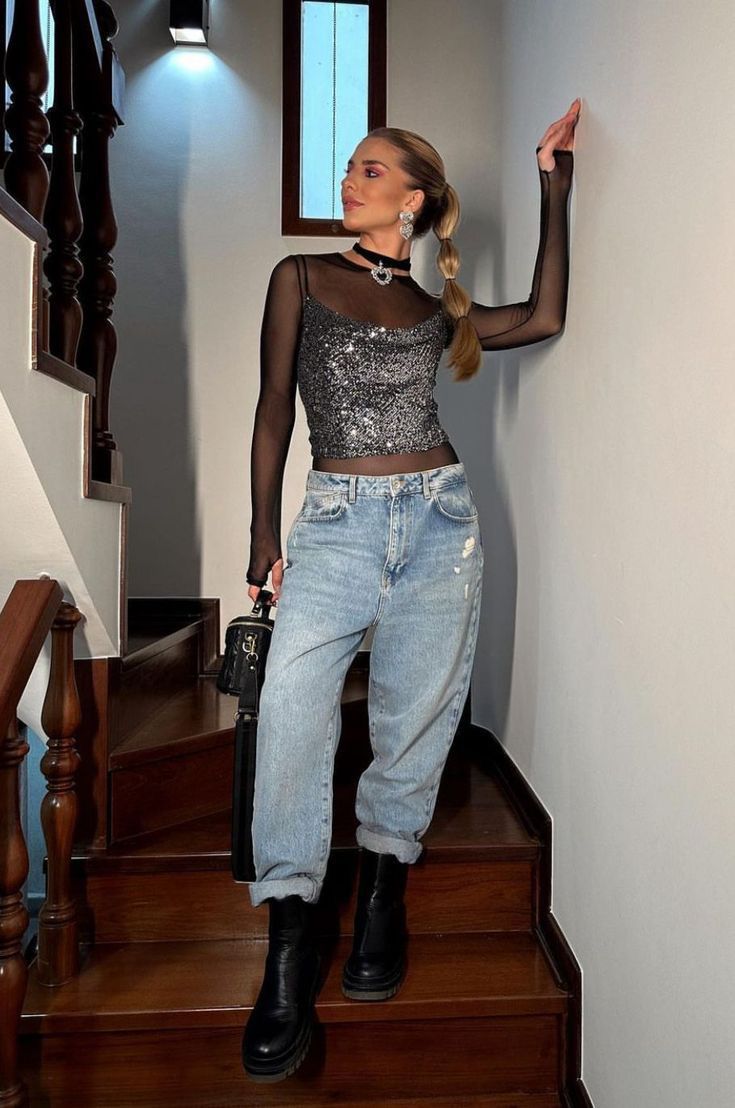 This sheer long-sleeve mesh top adorned with tiny silver sequins adds just the right amount of sparkle to a casual-chic look. Styled with light-wash boyfriend jeans and chunky black boots, this outfit perfectly blends comfort with trendiness. The high-neck detail adds sophistication, making it versatile for both daytime outings and evening events. A small black clutch and statement earrings complete the effortlessly cool vibe.