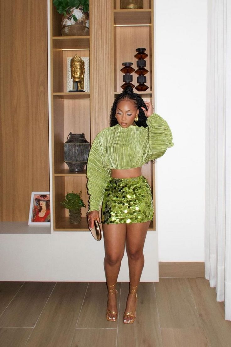 Make a night classy chic statement with this emerald feather crop top and sequin flare pants. This combination exudes glamor and is a great choice for a Vegas trip or an exclusive black-tie nightclub. The shimmer of the sequins contrasts beautifully with the playful feather texture. Keep your accessories bold yet refined—opt for statement earrings and a structured clutch. This look is for the confident woman who loves to embrace fabric drama.