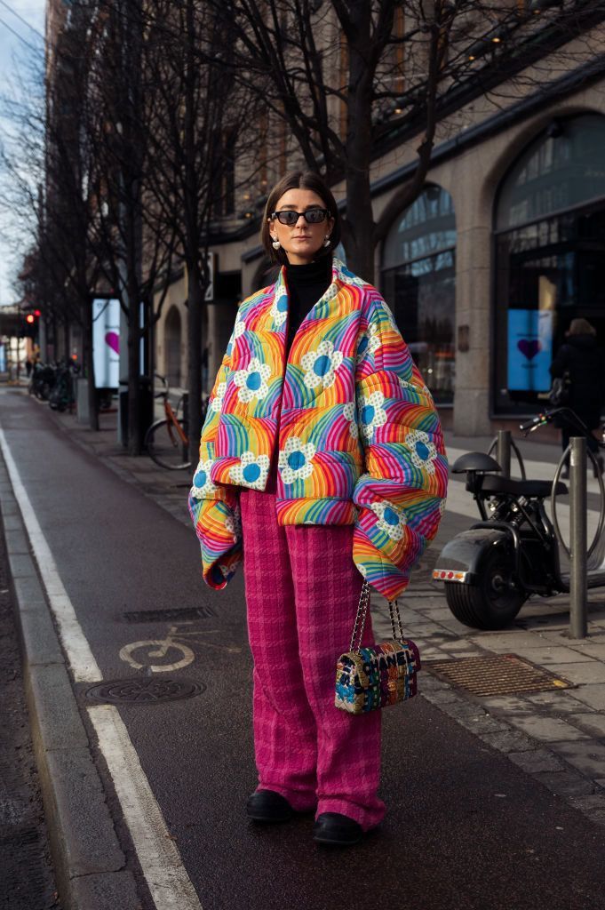 A true maximalist dream, this outfit features an oversized rainbow-patterned puffer jacket styled with textured fuchsia trousers. The eye-catching contrast of bright hues and mixed patterns makes this a standout look for fashion risk-takers. Paired with bold sunglasses and a designer mini handbag, this look screams confidence, fun, and unapologetic self-expression.